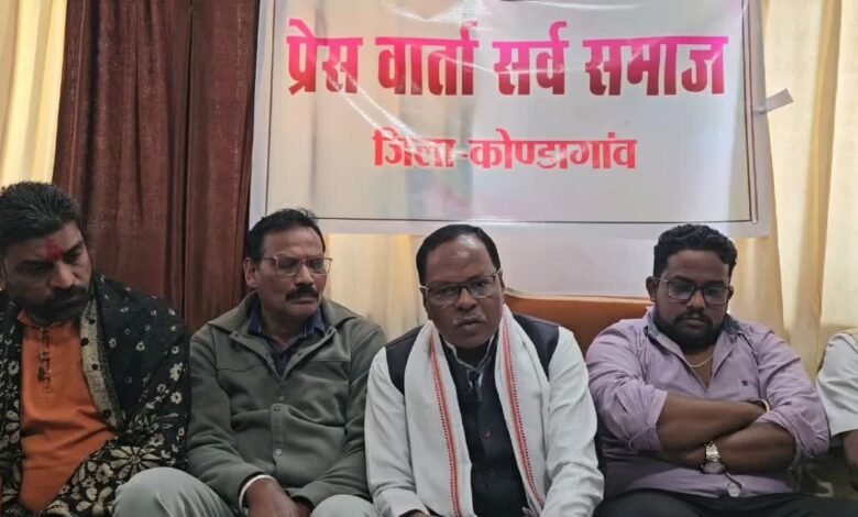 कोंडागांव: बस्तर संभाग के कोंडागांव जिले में सर्व समाज ने मंगलवार को प्रेस कॉन्फ्रेंस की. सर्व समाज ने 24 दिसंबर बुधवार को छत्तीसगढ़ बंद का आह्वान किया है. समाज की तरफ से आरोप लगाया गया है कि प्रदेश में सामाजिक अशांति फैलाई जा रही है और जनजातीय आस्था पर हमले किए जा रहे हैं. जनजातीय सुरक्षा मंच के प्रांत संयोजक गोरखनाथ बघेल ने प्रेस कॉन्फ्रेंस में कहा कि यह बंद पूरी तरह शांतिपूर्ण, लोकतांत्रिक और संवैधानिक दायरे में आयोजित किया जाएगा.