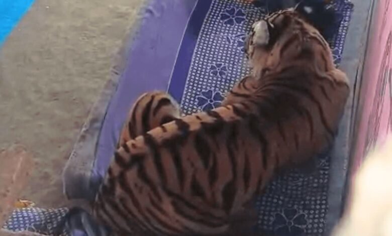 जब बिस्तर पर बैठ गया बाघ