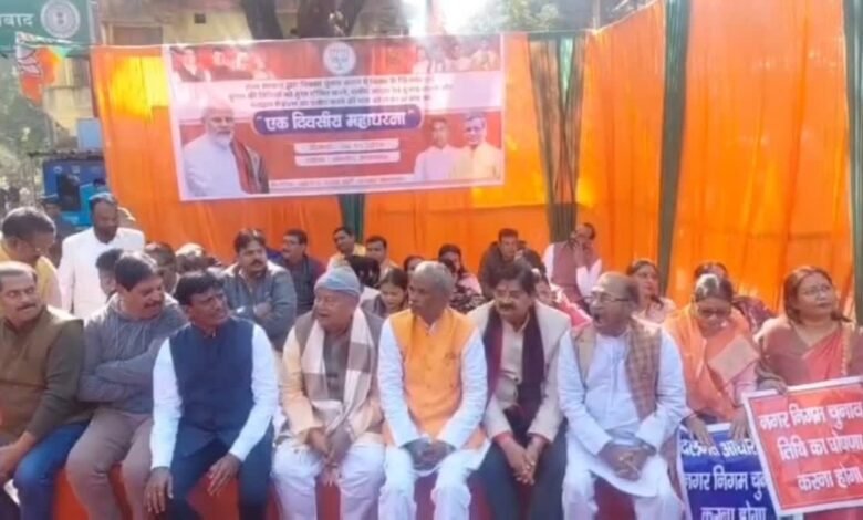 निकाय चुनाव में देरी पर गरजी भाजपा, धनबाद में धरना देकर सरकार को चेताया