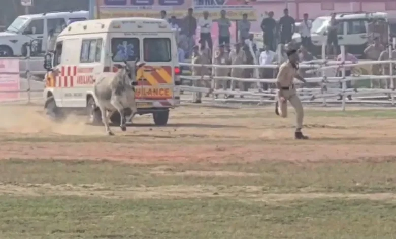 इसी दौरान अचानक एक सांड हेलीपैड कैंपस में घुस गया, जिससे वहां मौजूद पुलिसकर्मियों और अधिकारियों के बीच भागा-दौड़ी का माहौल बन गया. पुलिसकर्मियों ने सांड को भगाने की कोशिश की, लेकिन सांड ने उल्टा एक पुलिसकर्मी को ही खदेड़ दिया. काफी देर तक पुलिस और सुरक्षाकर्मी सांड को बाहर निकालने की कोशिश करते रहे. करीब एक घंटे की मशक्कत के बाद सांड को हेलीपैड कैंपस से बाहर भगाया जा सका. इस दौरान मौके पर कुछ देर के लिए भगदड़ जैसी स्थिति भी बन गई और बड़ी संख्या में पुलिस बल उसे काबू में करने में जुटा रहा.