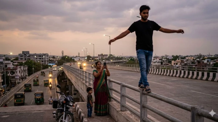 वायरल वीडियो में एक युवक फ्लाइओवर की ऊंची रेलिंग पर चढ़कर बिना किसी सहारे के पैदल चलता नजर आ रहा है। यह करतब बेहद खतरनाक था, क्योंकि वह संकरी कांक्रीट रेलिंग पर संतुलन बनाकर आगे बढ़ रहा था। हैरानी की बात यह रही कि सामने खड़ी उसकी पत्नी इस पूरे स्टंट का वीडियो अपने मोबाइल फोन से बना रही थी और उसे देखकर खुश हो रही थी।