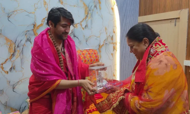धाम पर पं धीरेंद्र शास्त्री ने दादा गुरुदेव का चित्र, हनुमान जी व साधु जी सीताराम पुस्तक भेंट की. वहीं वसुंधरा राजे ने पीतांबरा माई के दर पर सिंदूर और प्रसाद भेंट किया. धाम पर बाबा बागेश्वर व राजस्थान की पूर्व सीएम के बीच करीब आधा घंटे तक विभिन्न बिंदुओं पर चर्चा होती रही. वहीं धाम के सेवादार नितेंद्र चौबे द्वारा पूर्व मुख्यमंत्री को बागेश्वर धाम की महिमा, सन्यासी बाबा की तपस्या, अत्यंत प्राचीन बागेश्वर महादेव के मंदिर की महिमा को विस्तार से समझाया.