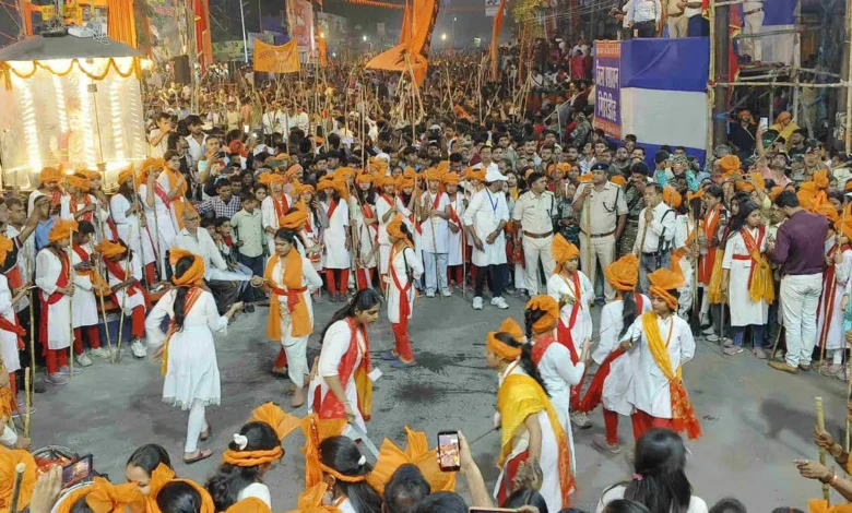 गिरिडीह: तनी हुई भौहें, सिर पर पगड़ी और हाथ में लाठी-तलवार. कुछ इसी तरह की तस्वीरें, इस रामनवमी में गिरिडीह शहर की सड़कों पर देखने को मिली. यहां एक वेश-भूषा, एक अंदाज और मुख से जय श्रीराम का नारा लगाती हुईं जब 304 बेटियों ने अखाड़े में अपना जौहर दिखाया तो सभी दंग रह गए. मंच पर बैठे मानिंद के साथ-साथ अखाड़ा देखने पहुंचे राहगीर, सबने बस ये ही कहा ‘छोरियां क्या छोरों से कम है.’